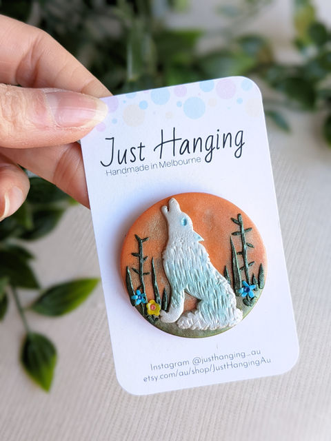 Just Hanging designs and creates a variety of jewellery pieces including stud & dangle earrings, rings, necklaces, and pins/brooches. Clip-on earrings are available upon request and these will be made to order. All earring studs, hooks and hoops are 304 stainless steel. Stud posts and pin backs are all embedded into the clay for extra strength and longevity.